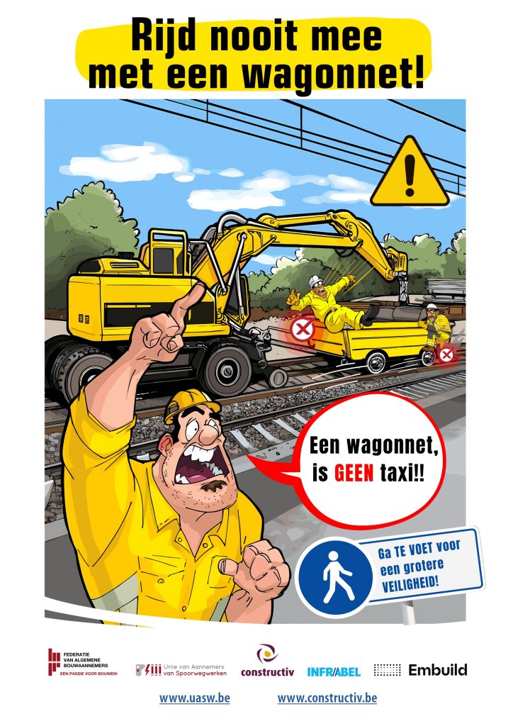 Samen met Infrabel en Constructiv lanceert Unie van Aannemers van Spoorwegwerken – Union des Entrepreneurs de Travaux Ferroviaires een nieuwe affiche in de preventiecampagne Max: 👉 “Rijd nooit mee op een waggonet!”